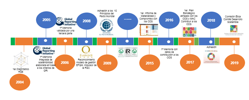 En el año 2004 realizamos nuestro primer acercamiento, con el primer diagnóstico de RSE. En el 2005 elaboramos la primera memoria anual de sostenibilidad en base a los criterios establecidos por el Global Reporting Iniciative (GRI). En el 2009 nos adherimos a los 10 principios del Pacto Mundial, adquiriendo el compromiso de informar anualmente en nuestras memorias de sostenibilidad de las acciones llevadas a cabo. Ya en la memoria del 2016, Mutualia integra y vincula los indicadores GRI con los 17 ODS.
