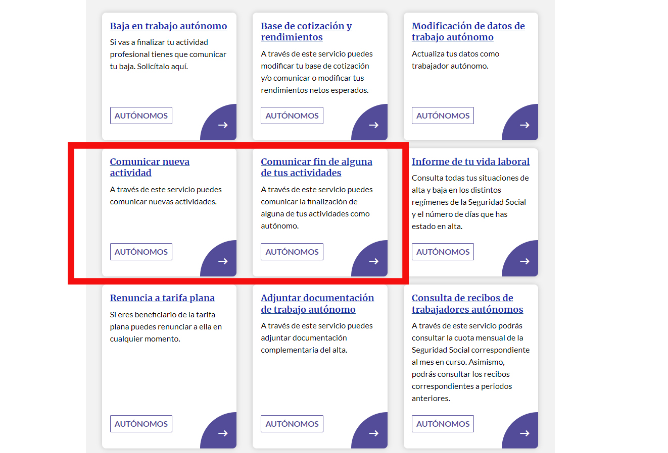 Este enlace redirige al área personal, desde donde el usuario puede acceder a su ficha de autónomo y podrá comunicar una nueva actividad. Los pasos de este proceso serán muy similares a los del alta inicial, salvo con algunas excepciones.