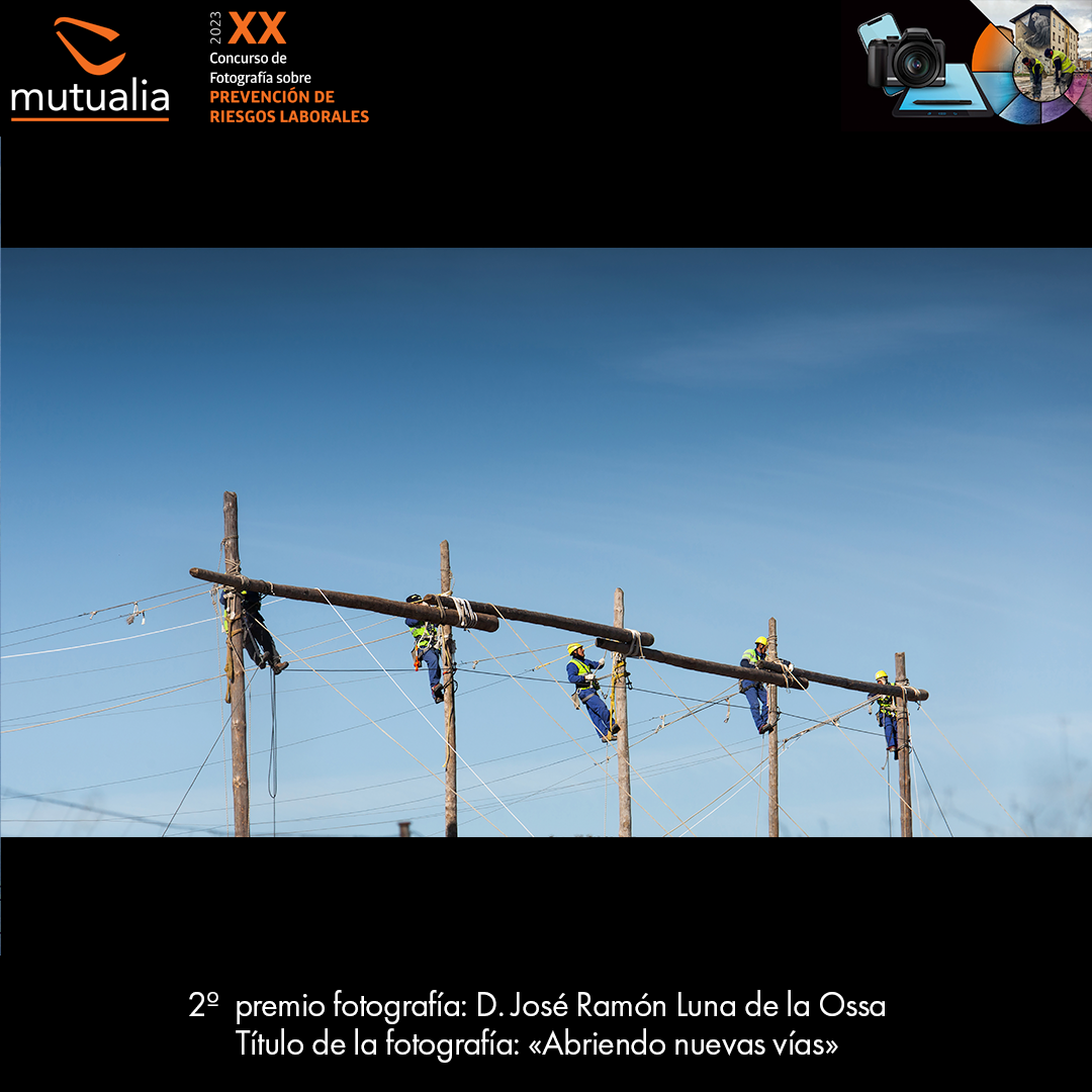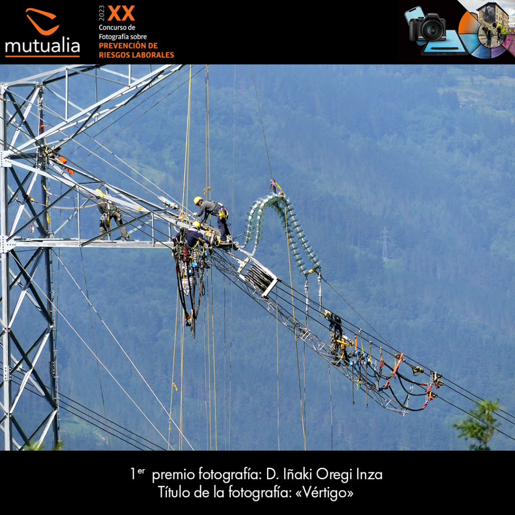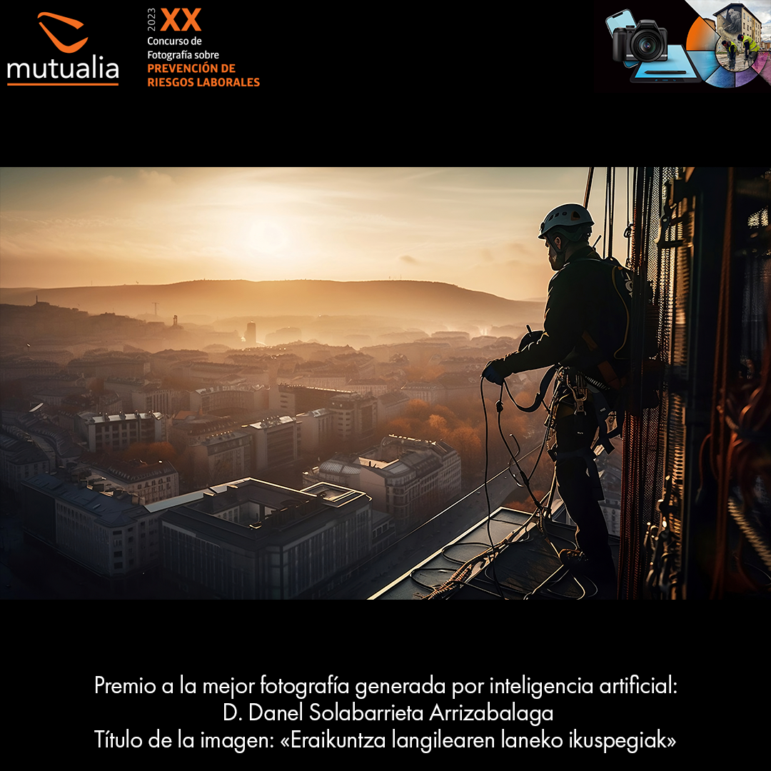 En cuanto al concurso de fotografía “Miradas de prevención”, el primer premio ha recaído en la instantánea “Vértigo”, realizada por Iñaki Oregi Inza. Además, en la edición de este año, Mutualia ha introducido una nueva categoría que premia a la mejor imagen generada por Inteligencia Artificial, resultando ganadora la representación “Eraikuntza langilearen laneko ikuspegiak”, cuyo prompt ha sido creado por Danel Solabarrieta Arrizabalaga con la aplicación Midjourney.