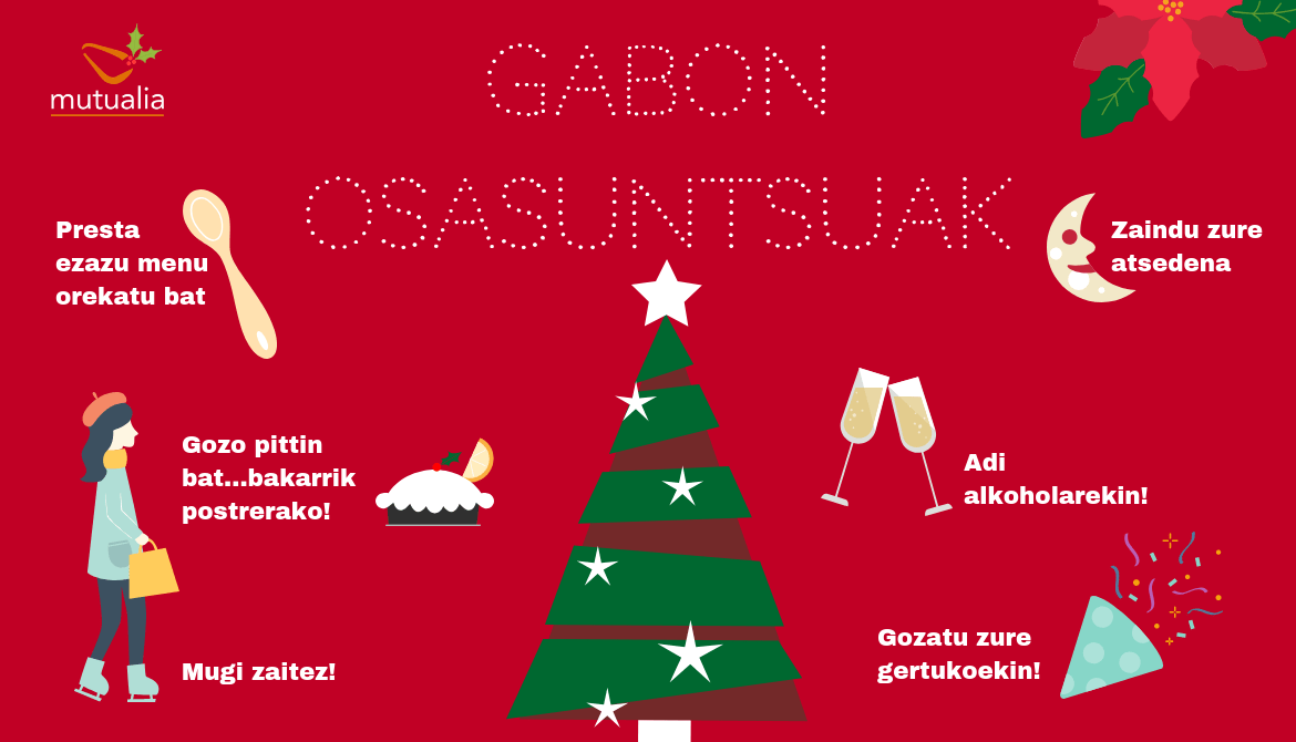 Nutrizioari eta ariketa fisikoari jaramon egiteaz gainera, ezin dugu alde batera utzi gure ongizate pertsonala. Egun hauek emozio bizien eta antolakuntzaren ondoriozko estresaren iturri izan daitezke. Gure ongizate emozionala orekatuta izateko, zer hobeto ekitaldi bakoitza aurrez planifikatzea baino? Hurbileko pertsonez inguratu, hitz egin, barre egin, eta are eurekin ibilaldia egitearen parekorik ez dago. Horrek guztiak oxigenatzen eta tentsio arteriala jaisten lagunduko digu. Halaber, garrantzitsua da atseden-ohitura onei eustea. Jaiegun hauetan, egun batzuetan ordutegiak aldatu, eta loaren ordua atzeratu egiten da. Munduko Osasun Erakundeak (MOE) gomendatzen du gutxienez egunean 6 orduz lo egitea, nahiz eta onena 8 orduz egitea den. Saia zaitez hori betetzen, eta lo hartzea kostatzen bazaizu, gogoan izan ariketak egin ditzakezula, bai eta meditatu, arnasketa-teknikak landu edo bainu erlaxagarri bat hartu ere.
