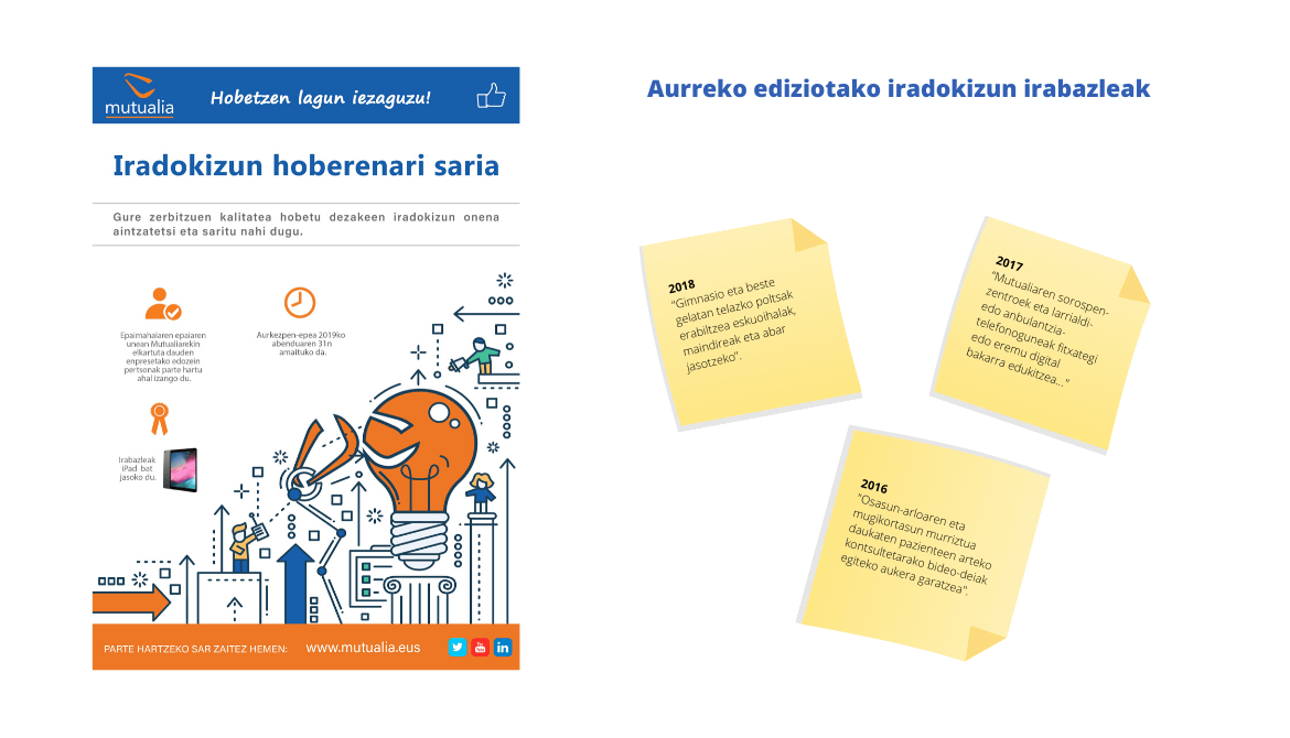 Dagoeneko jarri dugu martxan Iradokizun Hoberenari VIII. Saria. Sariketarekin, gure zerbitzuen kalitatea hobetzen lagunduko digun urteko ideiarik onena aitortu nahi dugu. Ekimena gure enpresa elkartuetako eta lankide ditugun aholkularitzetako langileei xedaturik dago.