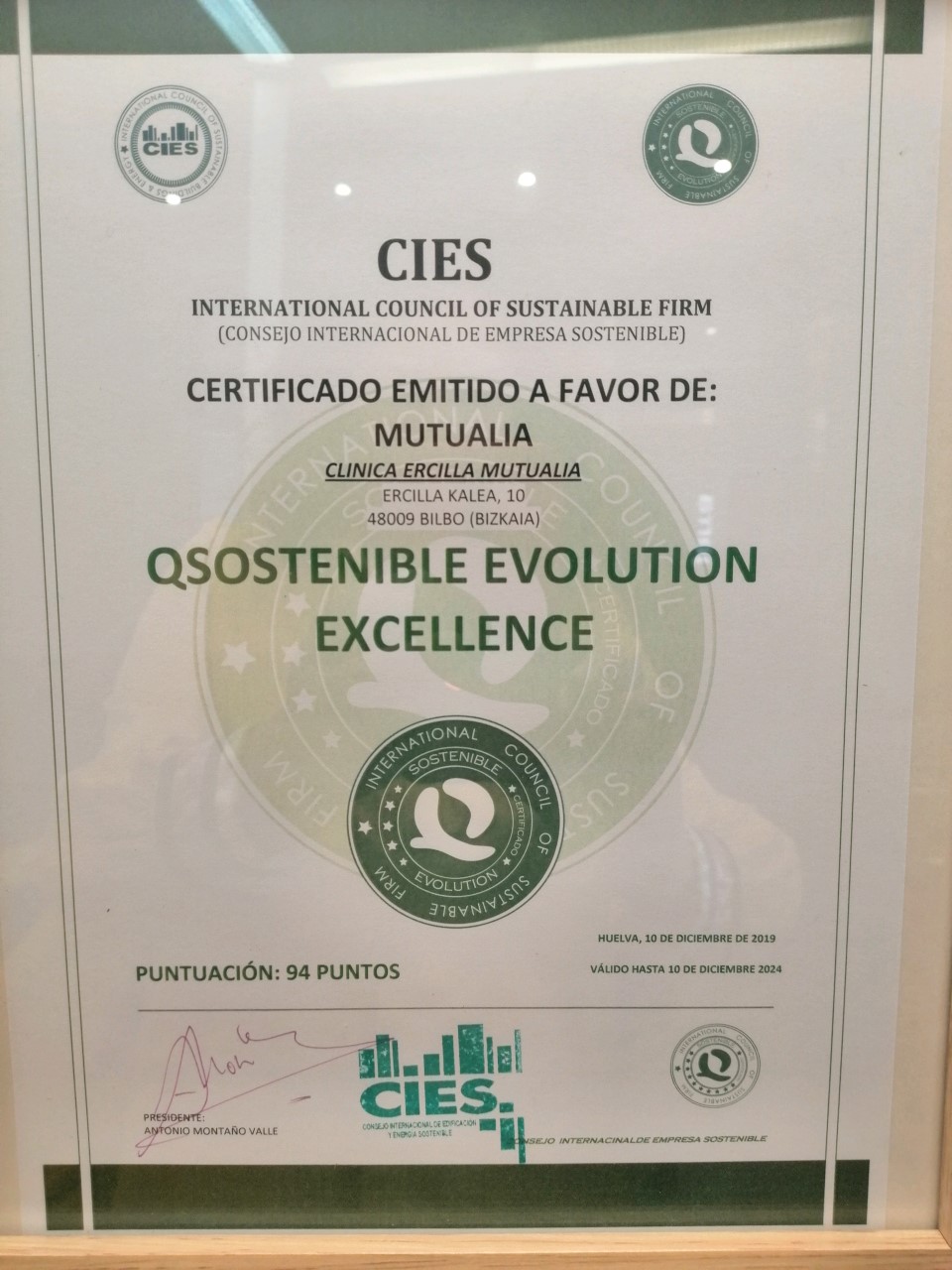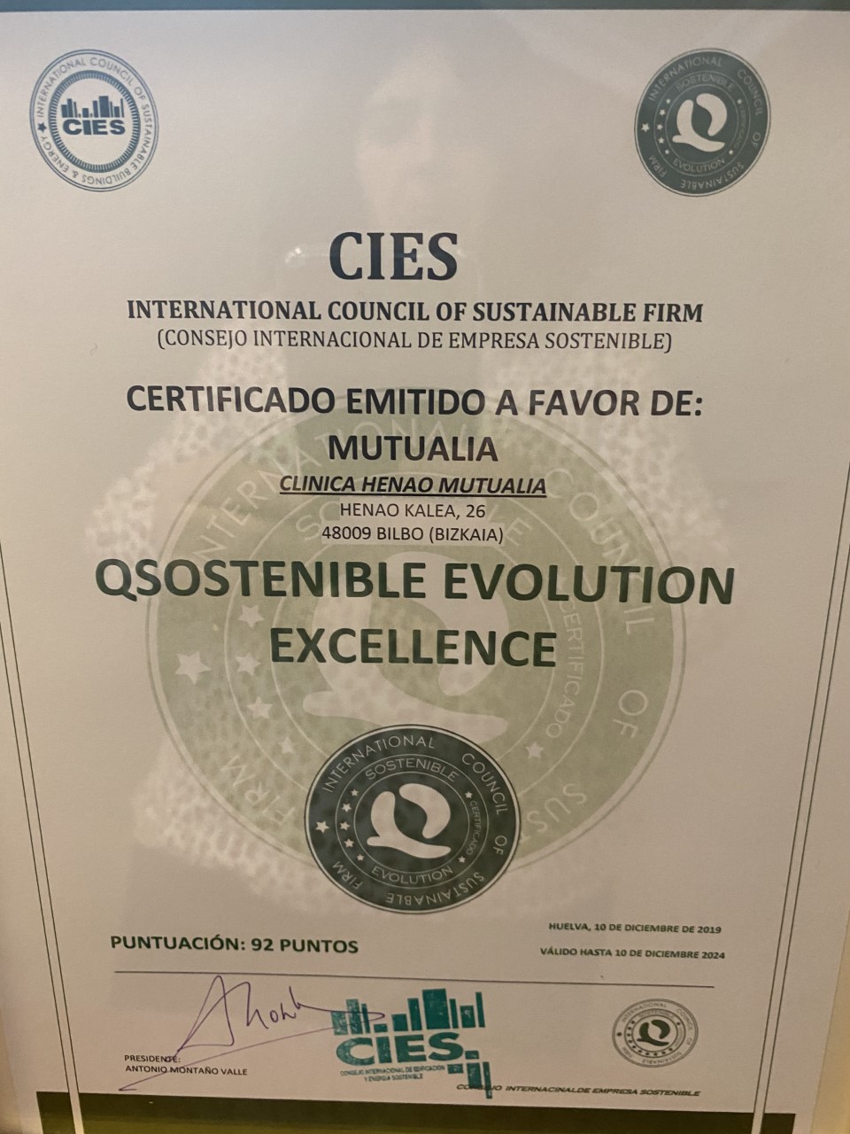 Zigiluaren banaketa-ekitaldiak asistentzia zentro bietan egin ziren; horietan, Enpresa Iraunkorren Nazioarteko Kontseiluaren (CIES) lehendakari Antonio Montañok Q Sostenible Evolution Excellence zigilua eman zien Victor Echenagusia eta zentro bakoitzean lanean ari ziren lantaldeko kideei.