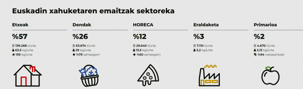 Euskadin, 111 kg elikagai-hondakin sortzen ditu pertsona batek urtean; guztira, 244.972 tona. Elikagai-hondakinen erdiak baino gehiago etxeetan sortzen dira, eta, ondoren, merkataritza-zerbitzuetan eta hotel, jatetxe eta kafetegietan. Hona hemen datuak sektorearen arabera (infografia. Iturria: ELIKA)