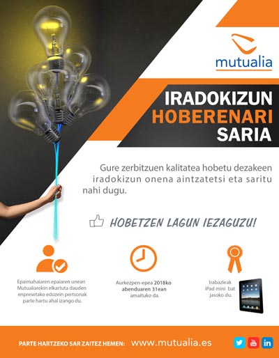 Mutualiak VII. urtez antolatu du Iradokizun Hoberenari Saria. Lehiaketaren xedea da gure zerbitzuen kalitatea hobetzen lagunduko digun urteko ideiarik onena aitortzea. Azken edizioaren irabazlea JOSE CRUZ GONZALEZ MURUAren iradokizuna izan da, Kutxabankeko langilea.