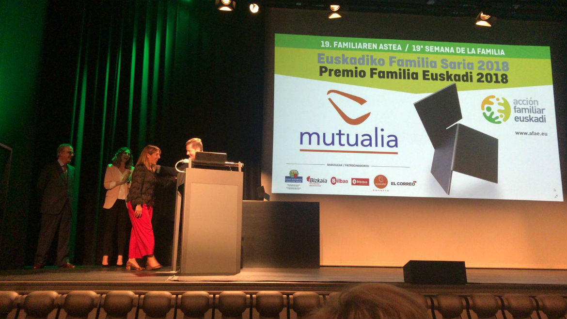 Mutualiak AFAEk (Acción Familiar Euskadi) ematen duen Euskadiko Familia Saria 2018 eskuratu du “bere langileen kontziliazioarekin betetako konpromiso zabalari esker”. Miren Fernández-ek, Mutualiako Pertsonen Garapenerako zuzendariak jaso zuen saria atzo, hilak 30, Bilboko Azkuna Zentroak hartu zuen galaren baitan. Euskadiko Familia Sariek familiaren mesederako ekintza edo proiektuak garatzen dituzten enpresa, erakunde edota pertsonak saritzea dute helburu, betiere Euskadi aurreratu, solidario eta eraldatzaile baten ikuspegi berritzailearekin egiten badira.