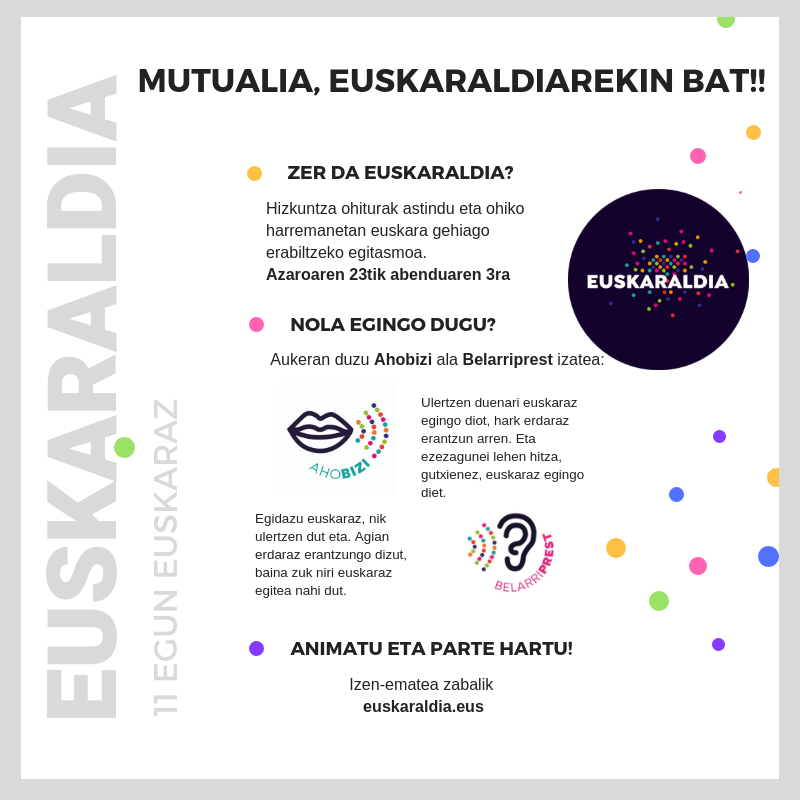 Mutualiak bat egin du Euskaraldiarekin. Azaroaren 23tik abenduaren 3ra bitarte gauzatuko da egitasmoa, eta 11 egun horietan hizkuntza ohiturak astindu eta ohiko harremanetan euskara gehiago erabiltzea posible dela frogatzea du xede.