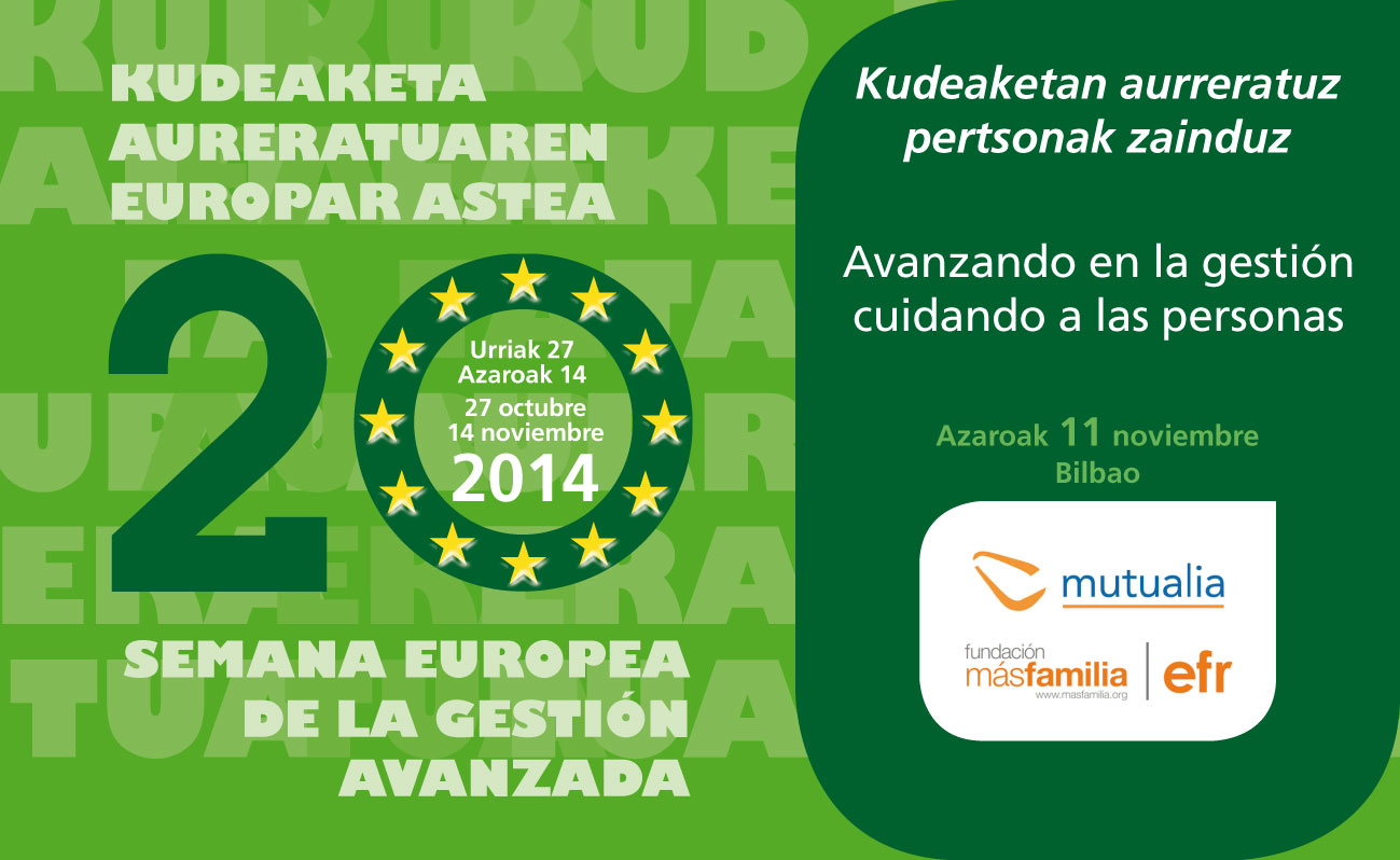 Datorren azaroaren 11rako, MUTUALIAk, “másfamilia” deituriko Fundazioarekin batera, “Kudeaketan aurreratuz pertsonak zainduz” jardunaldia antolatu du eta Bizkaiko Medikuen Elkargoan ospatuko da, Areilza Aretoan, Lersundi kalea, 9 – 6. solairuan, 11.00etatik 13.30etara.