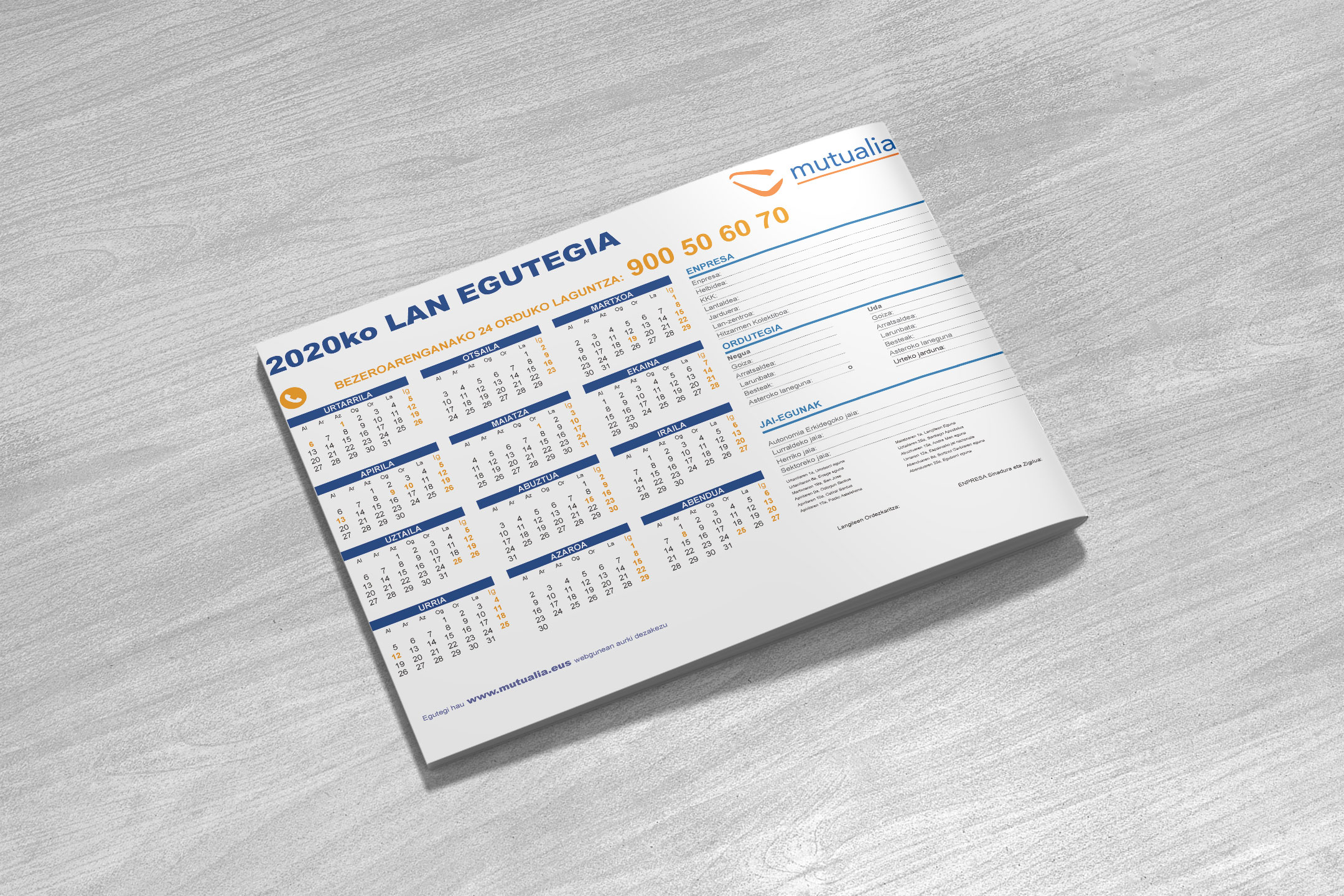 Mutualiak lan egutegi berria prestatu du 2020. urterako. Bertan, jaiegunen zerrenda dago jasota. Mutualiaren egutegia pdf betegarriaren formatuan dago eskuragarri , eta buletinak argitaratu ostean prestatu da, bertan baitaude jasota 2020. urteko jaiegunen zerrendak.